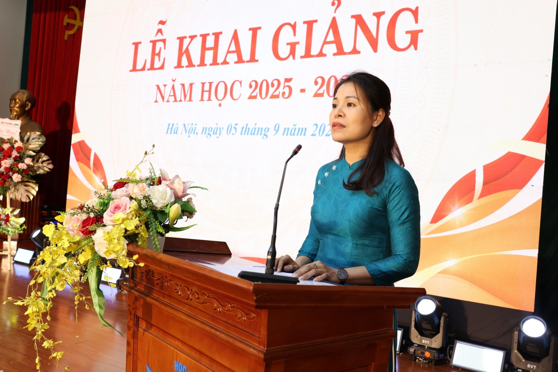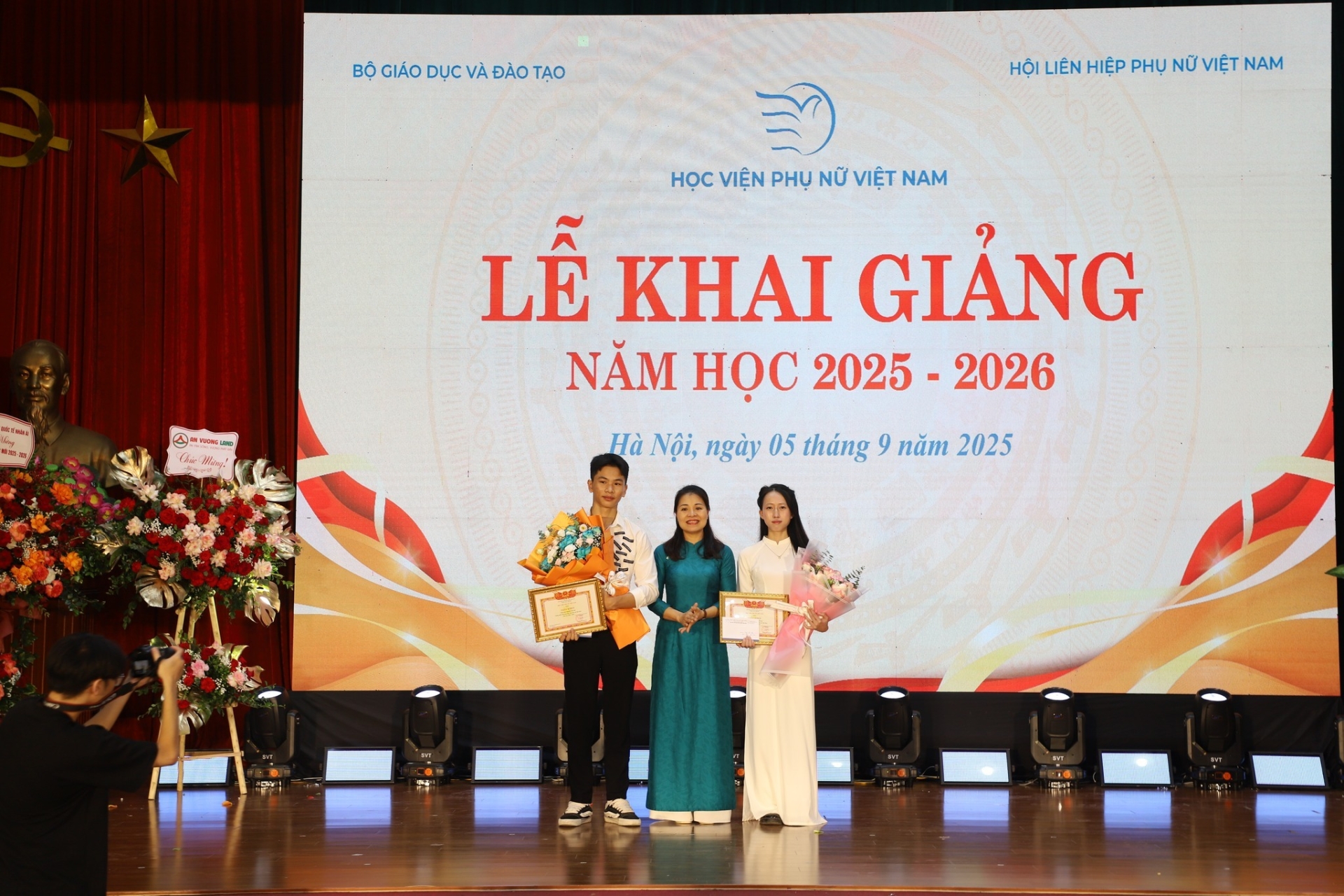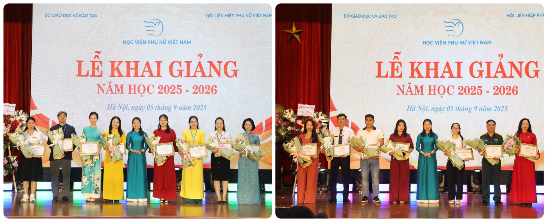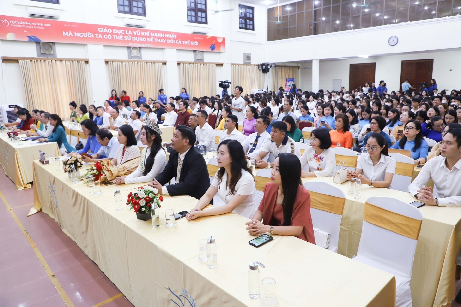 Buổi lễ có sự hiện diện của đồng chí Nguyễn Thị Minh Hương – Ủy viên Ban Thường vụ Đảng ủy Trung ương Hội, Phó Chủ tịch Hội Liên hiệp Phụ nữ Việt Nam, đại diện các cơ quan ban ngành, các doanh nghiệp, đối tác, nhà tài trợ, cùng các cơ quan báo chí. Về phía Học viện có đồng chí Nguyễn Thị Thu Hương – Phó Giám đốc Học viện, lãnh đạo các đơn vị, tổ chức đoàn thể, cán bộ, giảng viên, người lao động và các học viên, sinh viên. Đặc biệt, buổi lễ năm nay vinh dự có sự tham dự và chúc mừng của Hoa hậu Trái đất Việt Nam 2025 – Ngô Thị Trâm Anh, sinh viên Khoa Quản trị kinh doanh, Học viện Phụ nữ Việt Nam. Sự xuất hiện của Trâm Anh – người trưởng thành từ cuộc thi Sinh viên thanh lịch do Học viện tổ chức – đã mang đến niềm tự hào và truyền cảm hứng mạnh mẽ đến toàn thể sinh viên trong ngày khai trường.