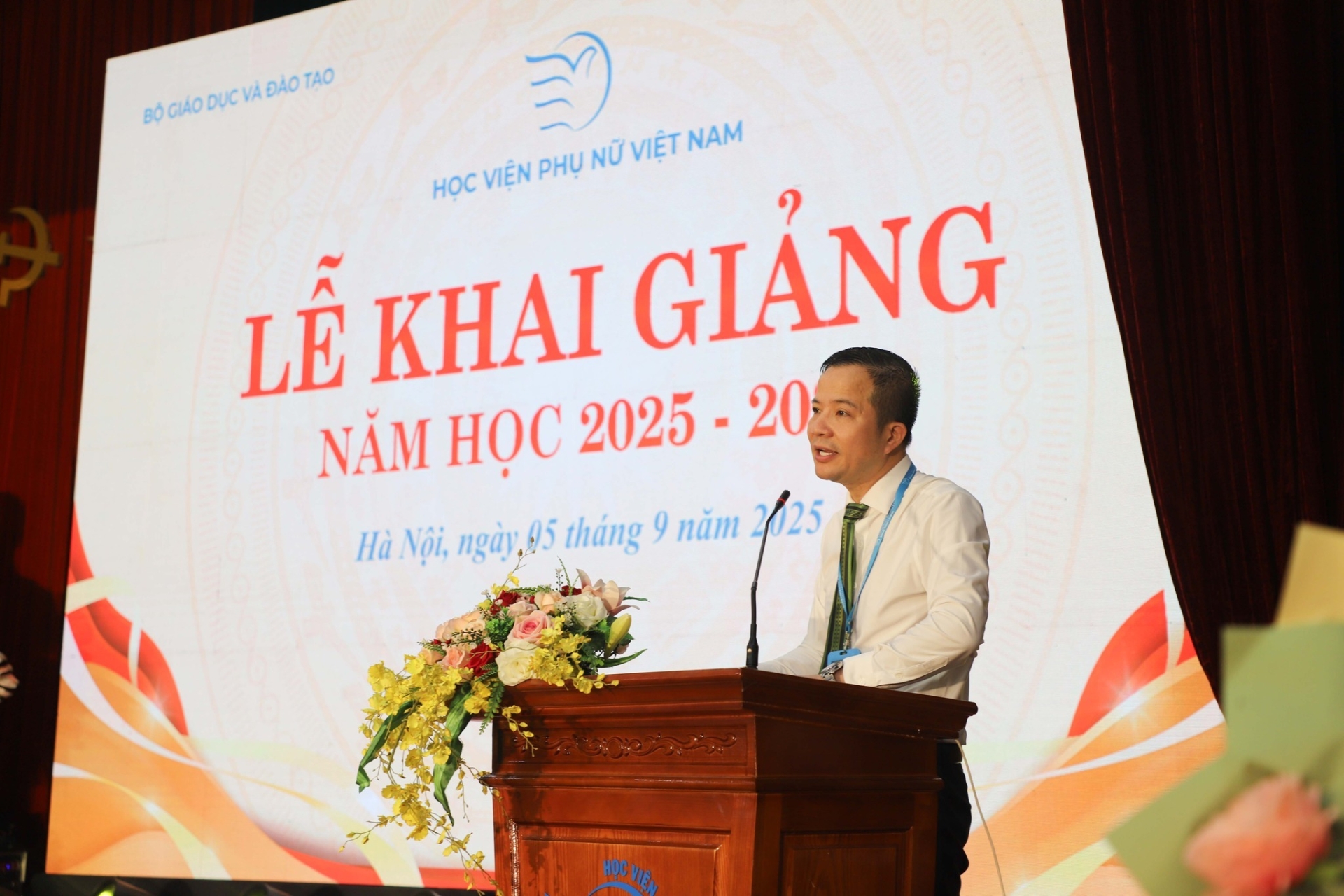 Sau phần tiếp sóng trực tiếp Lễ Khai giảng toàn quốc và kỷ niệm 80 năm thành lập Bộ GD&ĐT, ngay tại phần mở đầu lễ khai giảng, TS. Nguyễn Phi Long – Trưởng phòng Đào tạo đã trang trọng công bố Quyết định trúng tuyển của hơn 2.000 tân sinh viên khóa 13. TS. Nguyễn Phi Long gửi lời chúc mừng nồng nhiệt đến các em – những gương mặt mới đầy khát vọng, đồng thời nhắn nhủ rằng đây sẽ là khởi đầu của một hành trình đặc biệt ý nghĩa và thành công, mở ra nhiều cơ hội để học tập, trưởng thành và tỏa sáng dưới mái trường Học viện Phụ nữ Việt Nam.