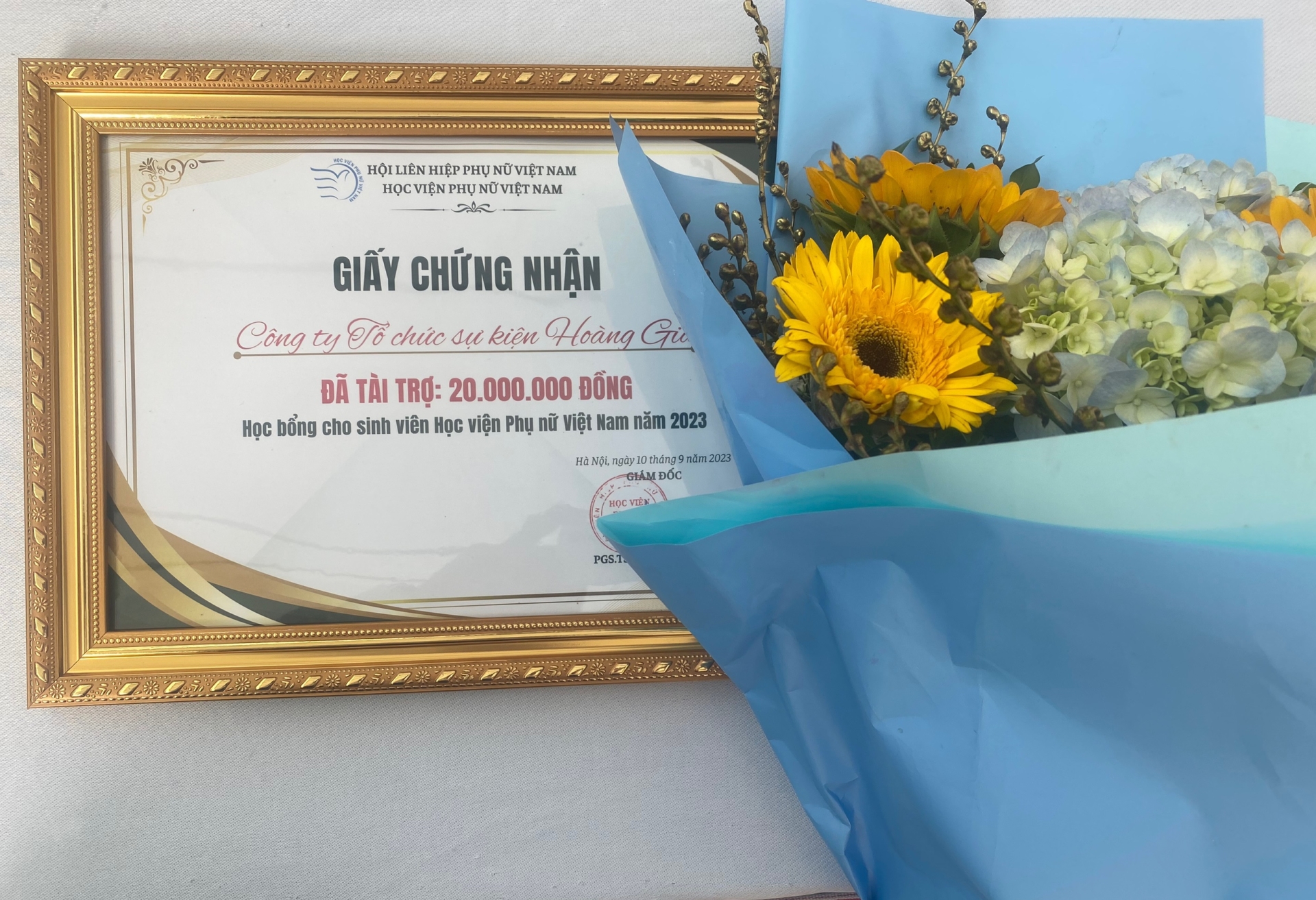 PGS.TS Trần Quang Tiến, Giám đốc Học viện Phụ nữ Việt Nam, trao hoa và giấy chứng nhận cho các đơn vị tài trợ