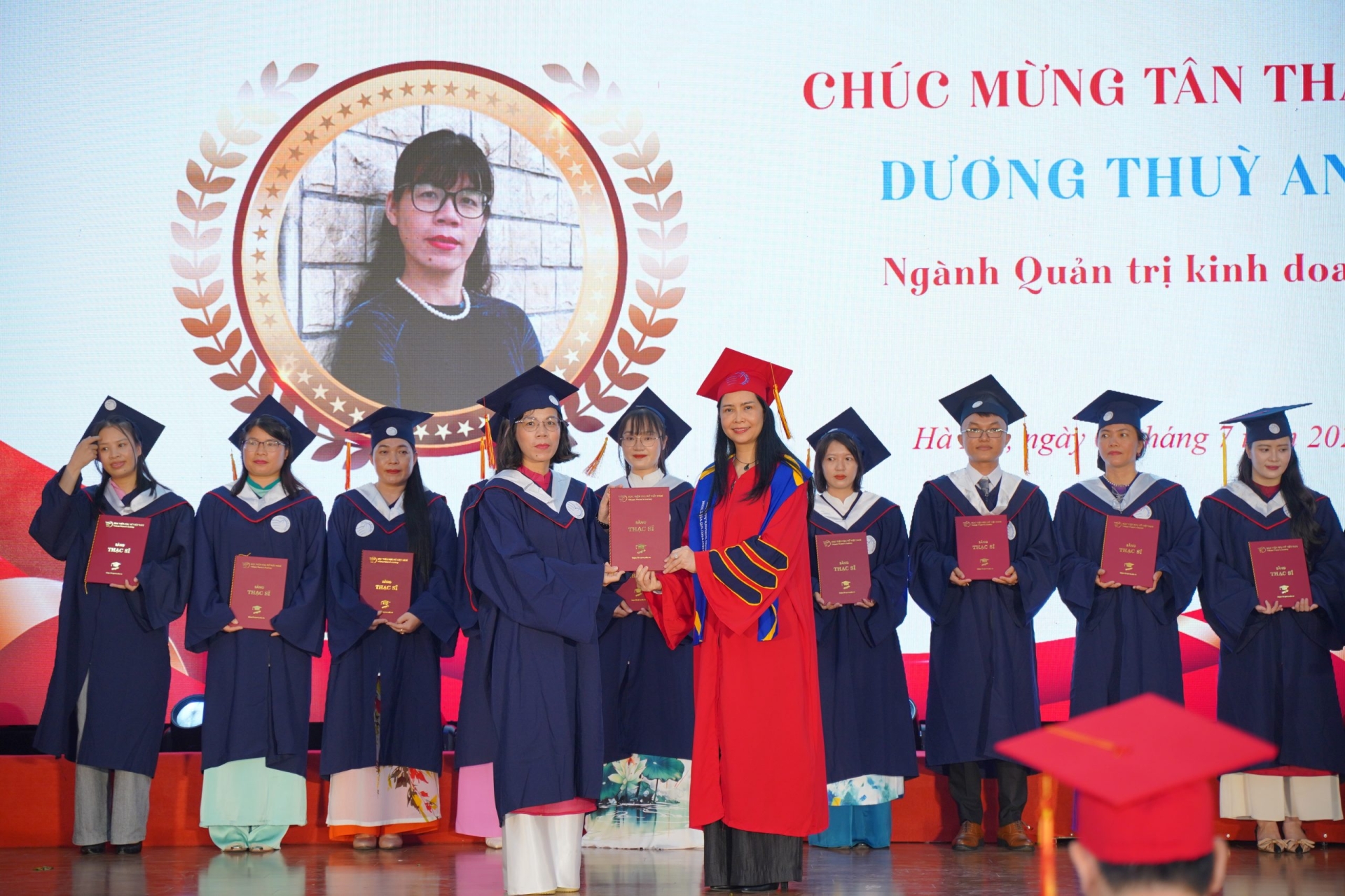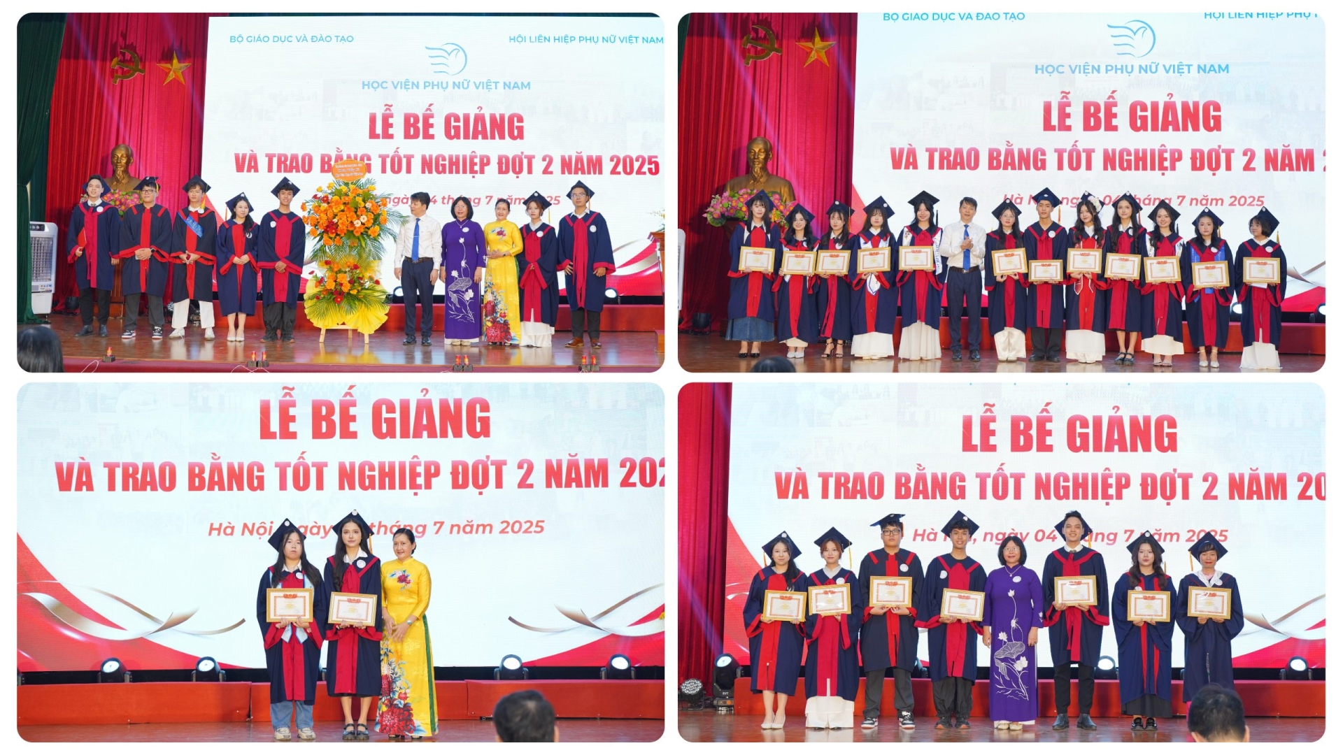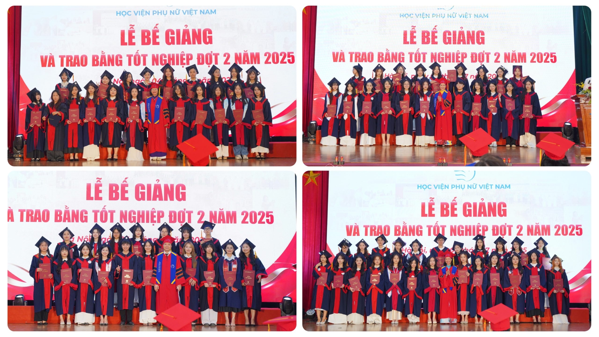 Tiếp nối phần nghi thức trang trọng là lễ trao bằng tốt nghiệp cho các tân thạc sĩ và sinh viên các ngành. TS. Trần Lan Phương – Phó Chủ tịch Hội Liên hiệp Phụ nữ Việt Nam, cùng Ban Giám đốc Học viện trực tiếp trao bằng và gửi lời chúc mừng đến từng tân khoa, khép lại một buổi lễ đầy cảm xúc và niềm tự hào.