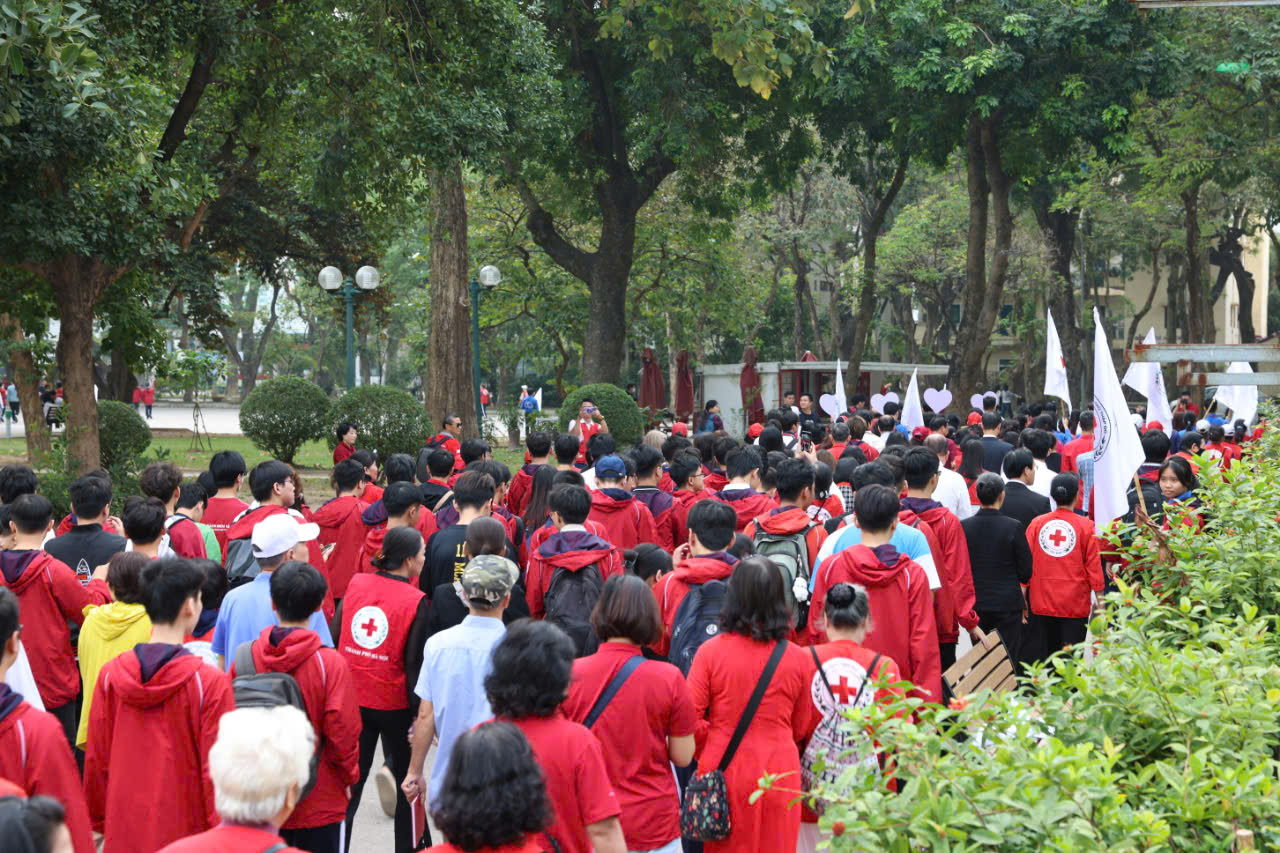 Các đại biểu, cán bộ, hội viên, tình nguyện viên của Hội Chữ thập đỏ Hà Nội và sinh viên Đại học Bách khoa Hà Nội đi bộ hưởng ứng Chiến dịch.